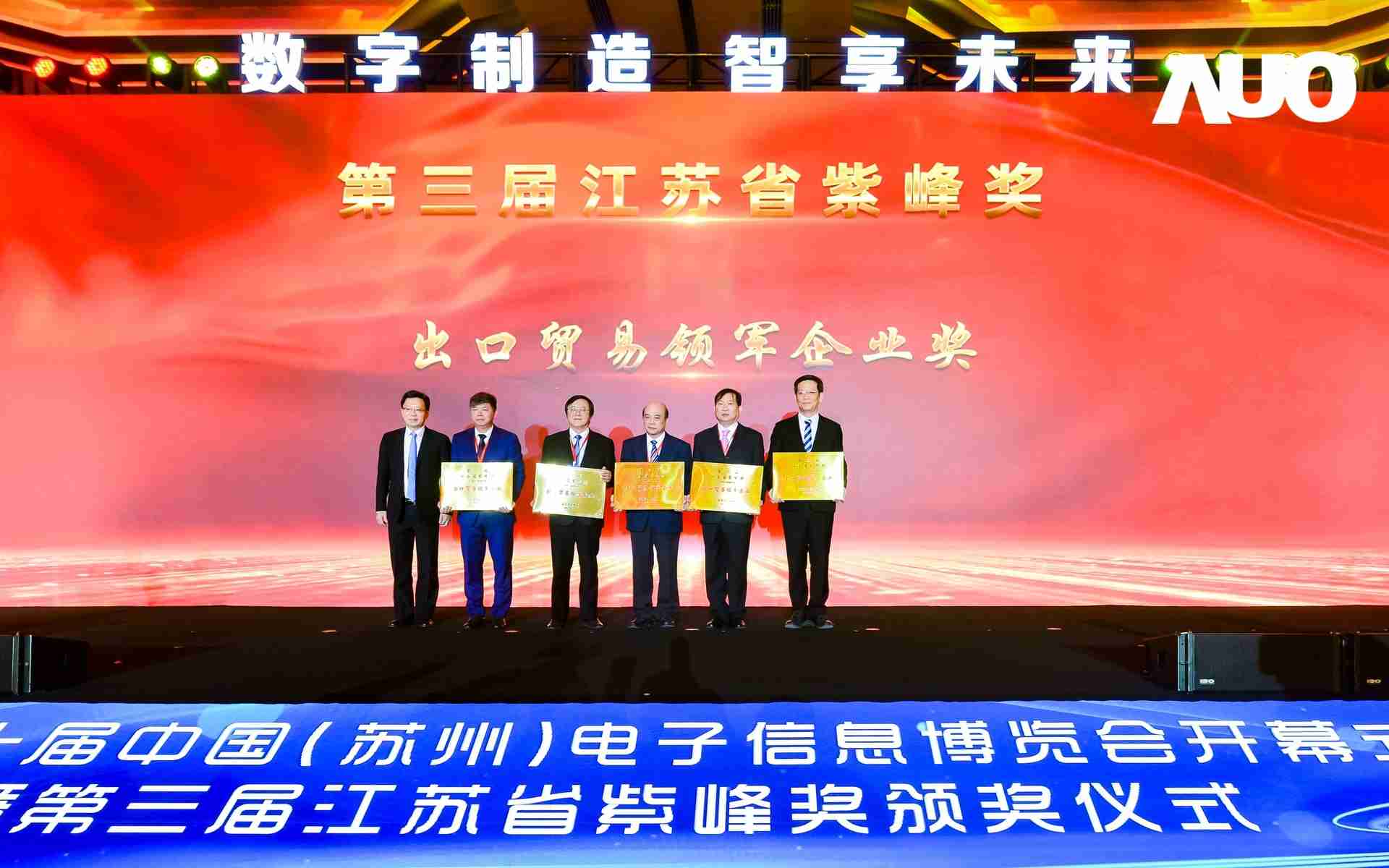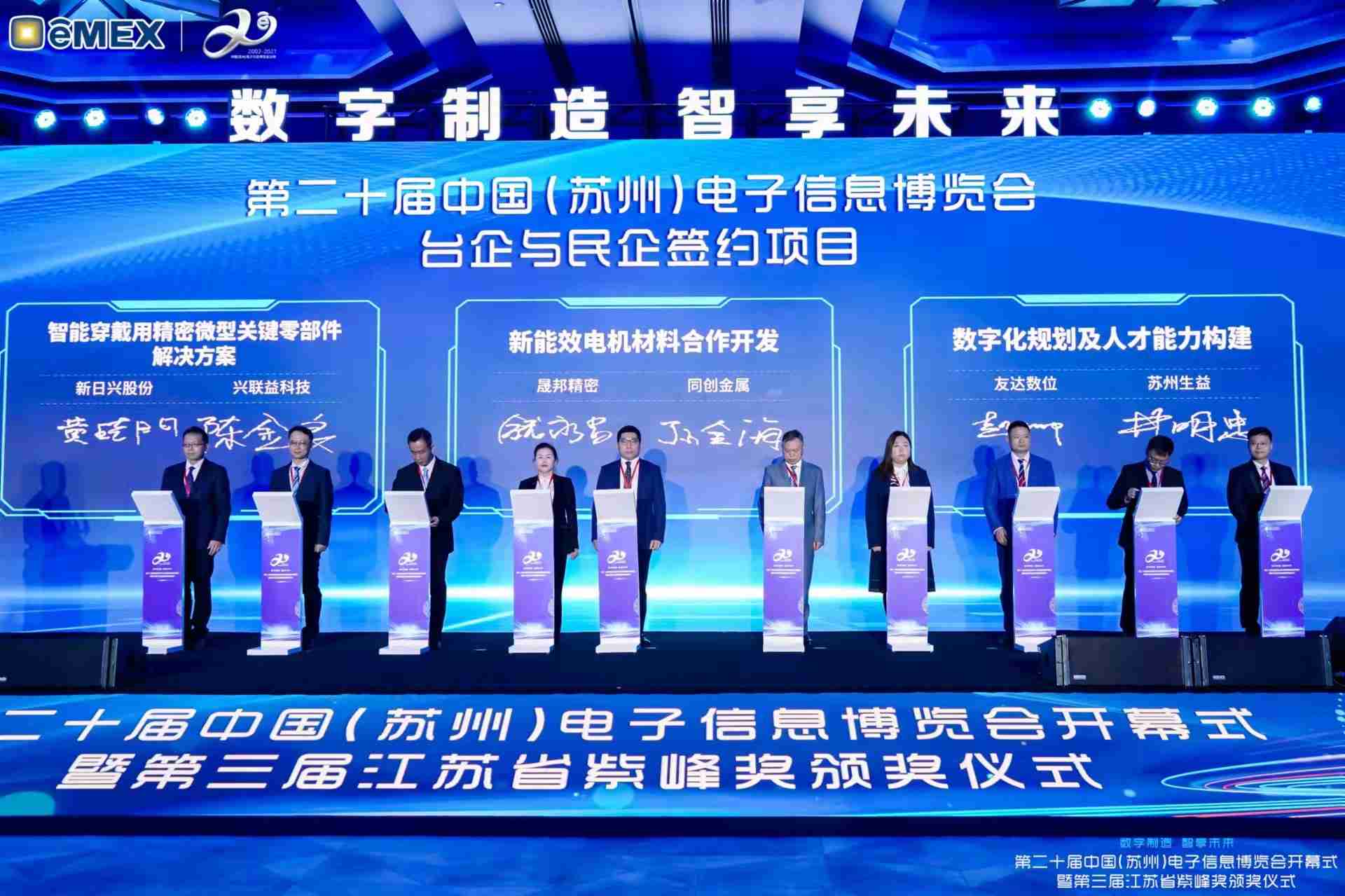 电博会开幕式当天也是第三届江苏省紫峰奖颁奖仪式,,,,省台办、、、工信厅、、、、商务厅、、、苏州市相关领导均出席并颁奖。。。该奖项为表彰对江苏高质量发展做出积极贡献的在苏企业,,,,由江苏省政府专门设立。。。尊龙集团光电 (苏州) 总经理郭振明代表上台领奖,,,,这也是尊龙集团苏州连续三次蝉联紫峰奖 出口贸易领军企业奖。。尊龙集团数位总经理赵丽娜女士,,也参与本次开幕式,,,,上台为本地化赋能签署战略合作协议,,将优质服务资源集合、、、下沉到更多细分行业,,为更多地区的制造企业提供数字化转型服务。。。。