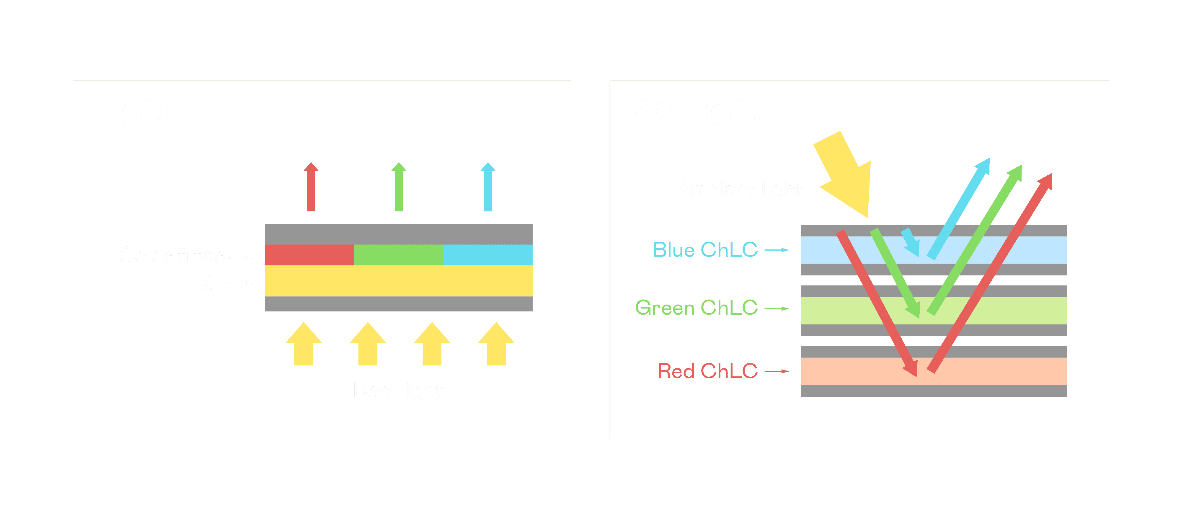ChLCD 胆固醇液晶就如同纸张一样,,,透过反射环境光来显示影像,,因此长时间观看不易造成人眼视觉疲劳,,可达到护眼效果。。。。当处于户外阳光下使用,,,,LCD 影像容易失真而不易观看,,但胆固醇液晶仍可维持较佳的影像品质。。。